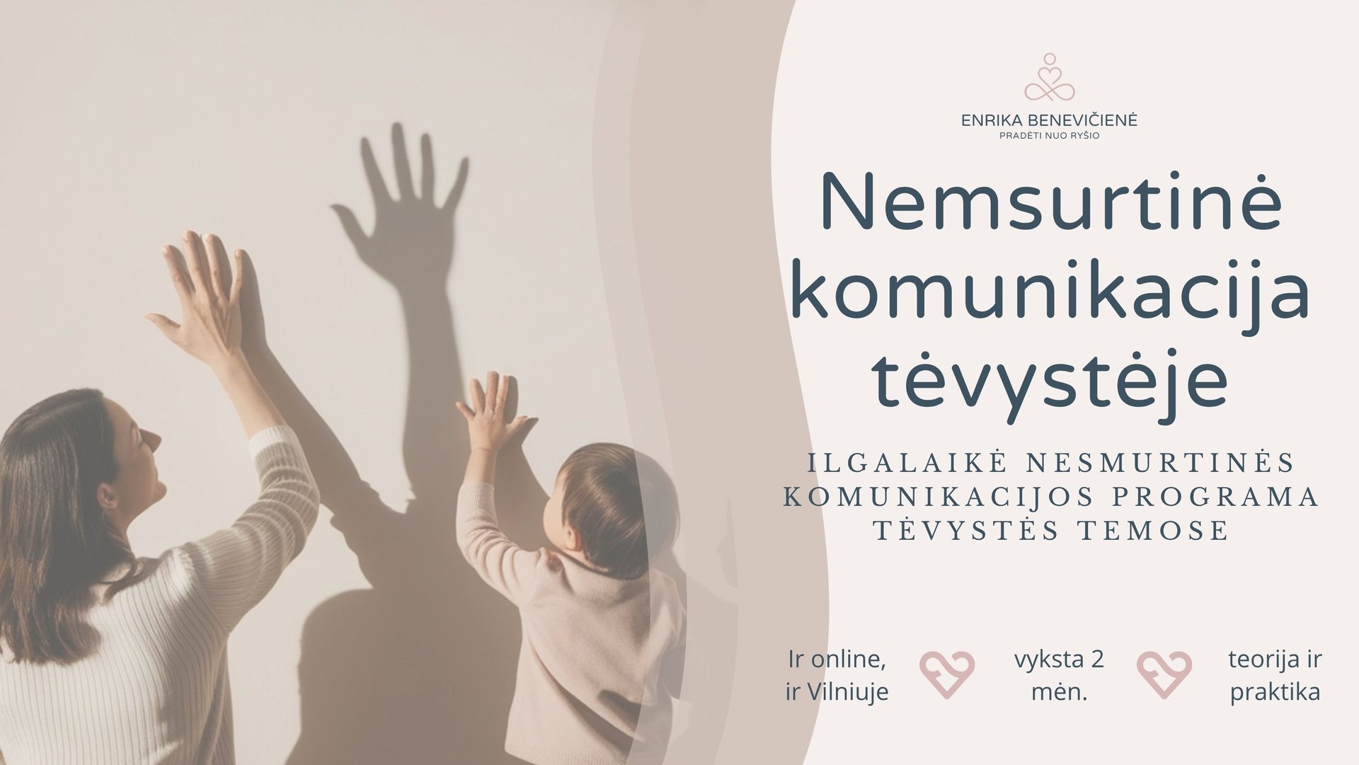 Kviečiu į ilgalaikę programą, sukurtą tėvams. Programos metu pereisime labai svarbius teorinius aspektus, bet dar daugiau praktikuosimės. Imsime realius, gyvenimiškus scenarijus, giluminiu būdu nagrinėsime kiekvieną iš jų bei konstruosime elgesio modelius, kurie stiprintų ryšį, bet neištrintų ribų. Iš naujo mokysimės klausytis ir girdėti už žodžių. Mokysimės išreikšti save, paleisdami scenarijus, su kuriais buvome užauginti patys. Bandysime prisijaukinti stiprias ir dideles emocijas. Ieškosime būdų nuraminti savo ir vaiko nervų sistemą ir atkurti pažeistą ryšį, pasitikėjimą ir artumą.
