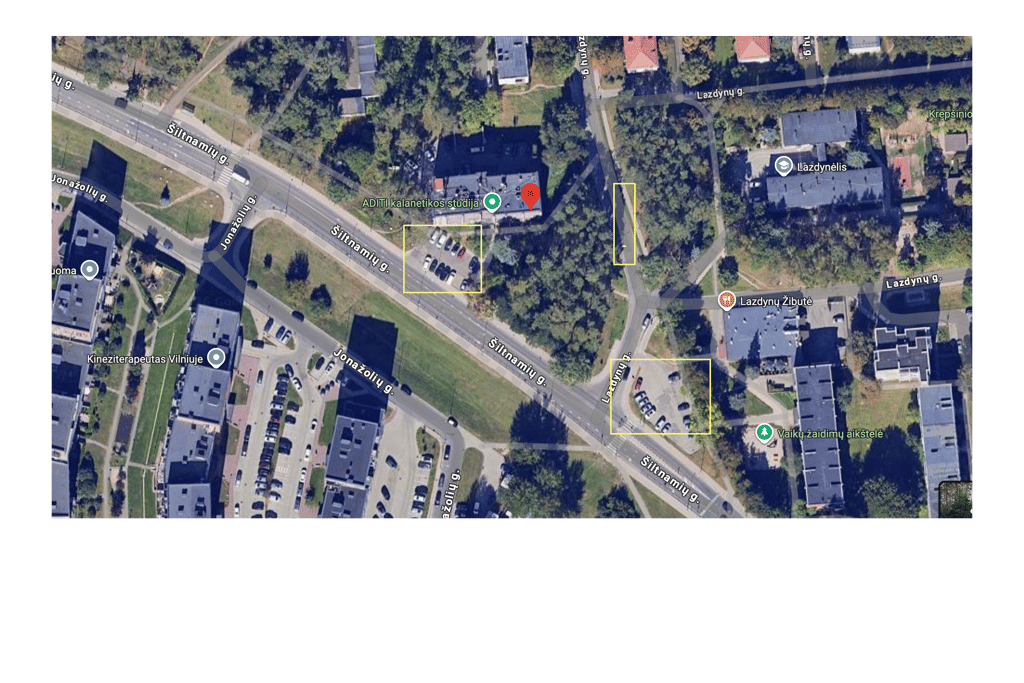 Greta pastato yra kelios vietos pasistatyti automobilius. Rekomenduojamos aikštelės pažymėtos geltonai žemėlapyje.